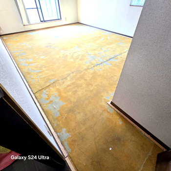 さらに既存床はPタイルが貼ってありましたが、劣化してぼろぼろに剥がれ足が引っかかる状態でした。